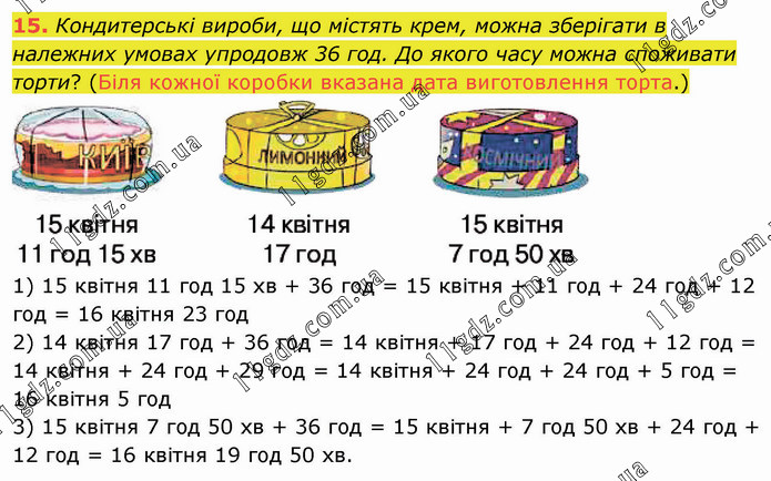 Кондитерські вироби, що містять крем, можна зберігати в належних умовах упродовж 36 год. До якого часу можна споживати торти? (Біля кожної коробки вказана дата виготовлення торта.) 1) 15 квітня 11 год 15 хв + 36 год = 15 квітня + 11 год + 24 год + 12 год = 16 квітня 23 год 2) 14 квітня 17 год + 36 год = 14 квітня + 17 год + 24 год + 12 год = 14 квітня + 24 год + 29 год = 14 квітня + 24 год + 24 год + 5 год = 16 квітня 5 год 3) 15 квітня 7 год 50 хв + 36 год = 15 квітня + 7 год 50 хв + 24 год + 12 год = 16 квітня 19 год 50 хв.