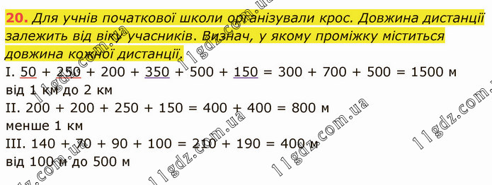 Для учнів початкової школи організували крос. Довжина дистанції залежить від віку учасників. Визнач, у якому проміжку міститься довжина кожної дистанції. І. 50 + 250 + 200 + 350 + 500 + 150 = 300 + 700 + 500 = 1500 м від 1 км до 2 км ІІ. 200 + 200 + 250 + 150 = 400 + 400 = 800 м менше 1 км ІІІ. 140 + 70 + 90 + 100 = 210 + 190 = 400 м від 100 м до 500 м