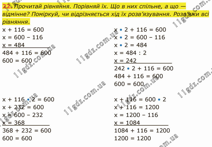 Прочитай рівняння. Порівняй їх. Що в них спільне, а що — відмінне? Поміркуй, чи відрізняється хід їх розв’язування. Розв’яжи всі рівняння. х + 116 = 600 х = 600 – 116 х = 484_______ 484 + 116 = 600 600 = 600 х • 2 + 116 = 600 х • 2 = 600 – 116 х • 2 = 484 х = 484 : 2 х = 242__________ 242 • 2 + 116 = 600 484 + 116 = 600 600 = 600 х + 116 • 2 = 600 х + 232 = 600 х = 600 – 232 х = 368_______ 368 + 232 = 600 600 = 600 х + 116 = 600 • 2 х + 116 = 1200 х = 1200 – 116 х = 1084________ 1084 + 116 = 1200 1200 = 1200
