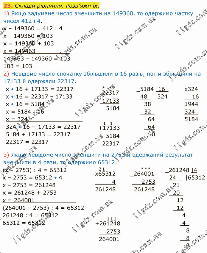 Склади рівняння. Розв’яжи їх. 1) Якщо задумане число зменшити на 149360, то одержимо частку чисел 412 і 4. х – 149360 = 412 : 4 х – 149360 = 103 х = 149360 + 103 х = 149463__________ 149463 – 149360 = 103 103 = 103 2) Невідоме число спочатку збільшили в 16 разів, потім збільшили на 17133 й одержали 22317. х • 16 + 17133 = 22317 х • 16 = 22317 – 17133 х • 16 = 5184 х = 5184 : 16 х = 324________________ 324 • 16 + 17133 = 22317 5184 + 17133 = 22317 22317 = 22317 Якщо невідоме число зменшити на 2753 й одержаний результат зменшити в 4 рази, то одержимо 65312. (х – 2753) : 4 = 65312 х – 2753 = 65312 • 4 х – 2753 = 261248 х = 261248 + 2753 х = 264001____________ (264001 – 2753) : 4 = 65312 261248 : 4 = 65312 65312 = 65312