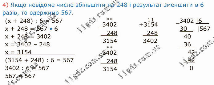 Якщо невідоме число збільшити на 248 і результат зменшити в 6 разів, то одержимо 567. (х + 248) : 6 = 567 х + 248 = 567 • 6 х + 248 = 3402 х = 3402 – 248 х = 3154____________ (3154 + 248) : 6 = 567 3402 : 6 = 567 567 = 567