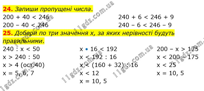 24. Запиши пропущені числа. 200 + 40 < 246 200 – 40 < 246 240 + 6 < 246 + 9 240 – 6 < 246 – 9 25. Добери по три значення х, за яких нерівності будуть правильними. 240 : х < 50 x > 240 : 50 x > 4 (ост.40) х = 5, 6, 7 х • 16 < 192 х < 192 : 16 х < (160 + 32) : 16 х < 12 х = 10, 5 200 – х > 175 х < 200 – 175 x < 25 х = 10, 5