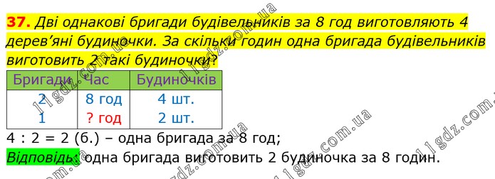Дві однакові бригади будівельників за 8 год виготовляють 4 дерев’яні будиночки. За скільки годин одна бригада будівельників виготовить 2 такі будиночки? Бригади Час Будиночків 2 1 8 год ? год 4 шт. 2 шт. 4 : 2 = 2 (б.) – одна бригада за 8 год; Відповідь: одна бригада виготовить 2 будиночка за 8 годин.