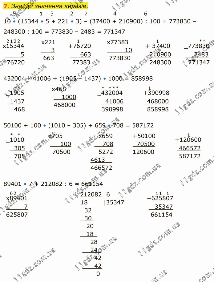 10 • (15344 • 5 + 221 • 3) – (37400 + 210900) : 100 = 773830 – 248300 : 100 = 773830 – 2483 = 771347; 432004 – 41006 + (1905 – 1437) • 1000 = 858998; 50100 + 100 • (1010 – 305) + 659 • 708 = 587172; 89401 • 7 + 212082 : 6 = 661154