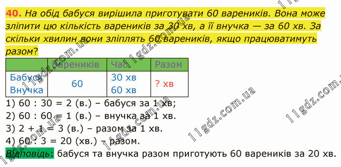 На обід бабуся вирішила приготувати 60 вареників. Вона може зліпити цю кількість вареників за 30 хв, а її внучка — за 60 хв. За скільки хвилин вони зліплять 60 вареників, якщо працюватимуть разом? 1) 60 : 30 = 2 (в.) – бабуся за 1 хв; 2) 60 : 60 = 1 (в.) – внучка за 1 хв. 3) 2 + 1 = 3 (в.) – разом за 1 хв. 4) 60 : 3 = 20 (хв.) – разом. Відповідь: бабуся та внучка разом приготують 60 вареників за 20 хв.