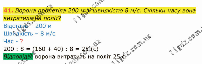 Ворона пролетіла 200 м зі швидкістю 8 м/с. Скільки часу вона витратила на політ? Відстань – 200 м Швидкість – 8 м/с Час - ? 200 : 8 = (160 + 40) : 8 = 25 (с) Відповідь: ворона витратить на політ 25 с.