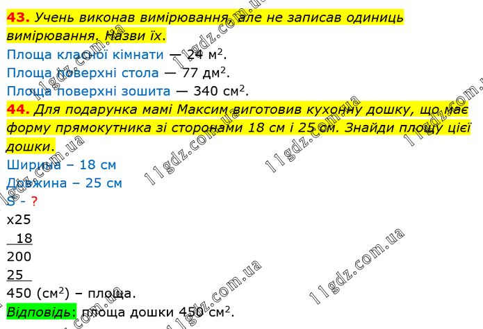 Учень виконав вимірювання, але не записав одиниць вимірювання. Назви їх. Площа класної кімнати — 24 м2. Площа поверхні стола — 77 дм2. Площа поверхні зошита — 340 см2. 44. Для подарунка мамі Максим виготовив кухонну дошку, що має форму прямокутника зі сторонами 18 см і 25 см. Знайди площу цієї дошки. Ширина – 18 см Довжина – 25 см 18 х 25 = 450 см2 Відповідь: площа дошки 450 см2.