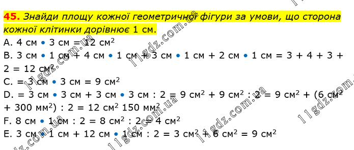 Знайди площу кожної геометричної фігури за умови, що сторона кожної клітинки дорівнює 1 см. А. 4 см • 3 см = 12 см2 В. 3 см • 1 см + 4 см • 1 см + 3 см • 1 см + 2 см • 1 см = 3 + 4 + 3 + 2 = 12 см2 С. = 3 см • 3 см = 9 см2 D. = 3 см • 3 см + 3 см • 3 см : 2 = 9 см2 + 9 см2 : 2 = 9 см2 + (6 см2 + 300 мм2) : 2 = 12 см2 150 мм2 F. 8 см • 1 см : 2 = 8 см2 : 2 = 4 см2 Е. 3 см • 1 см + 12 см • 1 см : 2 = 3 см2 + 6 см2 = 9 см2