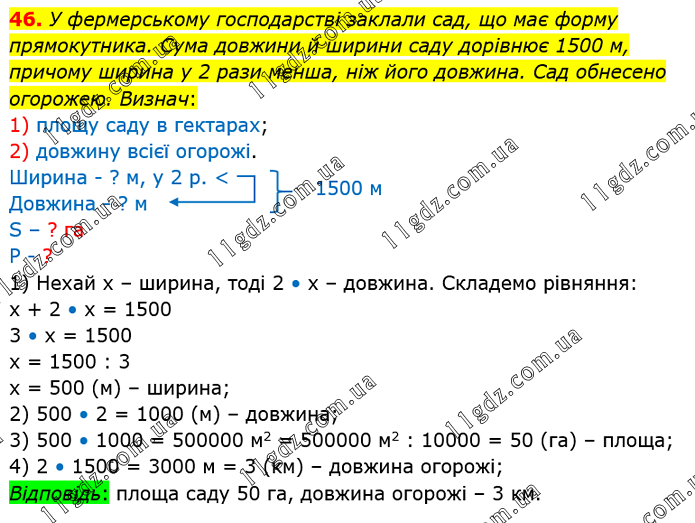 У фермерському господарстві заклали сад, що має форму прямокутника. Сума довжини й ширини саду дорівнює 1500 м, причому ширина у 2 рази менша, ніж його довжина. Сад обнесено огорожею. Визнач: 1) площу саду в гектарах; 2) довжину всієї огорожі. 1) Нехай х – ширина, тоді 2 • х – довжина. Складемо рівняння: х + 2 • х = 1500 3 • х = 1500 х = 1500 : 3 х = 500 (м) – ширина; 2) 500 • 2 = 1000 (м) – довжина; 3) 500 • 1000 = 500000 м2 = 500000 м2 : 10000 = 50 (га) – площа; 4) 2 • 1500 = 3000 м = 3 (км) – довжина огорожі; Відповідь: площа саду 50 га, довжина огорожі – 3 км.