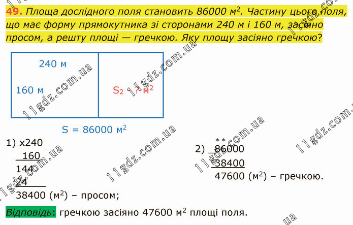 Площа дослідного поля становить 86000 м2. Частину цього поля, що має форму прямокутника зі сторонами 240 м і 160 м, засіяно просом, а решту площі — гречкою. Яку площу засіяно гречкою?