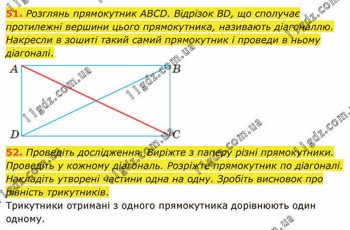 Розглянь прямокутник ABCD. Відрізок BD, що сполучає протилежні вершини цього прямокутника, називають діагоналлю. Накресли в зошиті такий самий прямокутник і проведи в ньому діагоналі. 52. Проведіть дослідження. Виріжте з паперу різні прямокутники. Проведіть у кожному діагональ. Розріжте прямокутник по діагоналі. Накладіть утворені частини одна на одну. Зробіть висновок про рівність трикутників. Трикутники отримані з одного прямокутника дорівнюють один одному.