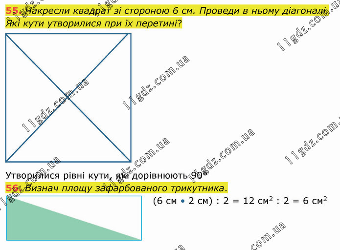 Накресли квадрат зі стороною 6 см. Проведи в ньому діагоналі. Які кути утворилися при їх перетині? Утворилися рівні кути, які дорівнюють 90° 56. Визнач площу зафарбованого трикутника. (6 см • 2 см) : 2 = 12 см2 : 2 = 6 см2
