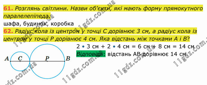 Розглянь світлини. Назви об’єкти, які мають форму прямокутного паралелепіпеда. шафа, будинок, коробка 62. Радіус кола із центром у точці С дорівнює 3 см, а радіус кола із центром у точці Р дорівнює 4 см. Яка відстань між точками А і В? 2 • 3 см + 2 • 4 см = 6 см + 8 см = 14 см Відповідь: відстань АВ дорівнює 14 см.