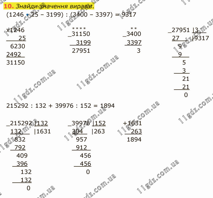 Знайди значення виразів. (1246 • 25 – 3199) : (3400 – 3397) = 9317 215292 : 132 + 39976 : 152 = 1894