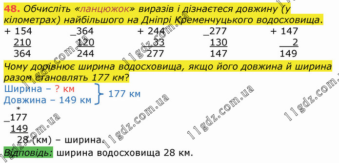 Чому дорівнює ширина водосховища, якщо його довжина й ширина разом становлять 177 км?