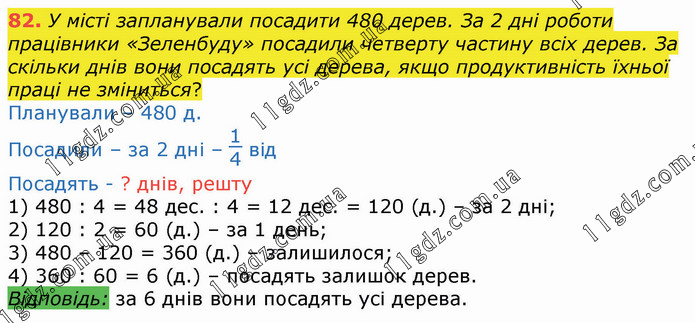 У місті запланували посадити 480 дерев. За 2 дні роботи працівники «Зеленбуду» посадили четверту частину всіх дерев. За скільки днів вони посадять усі дерева, якщо продуктивність їхньої праці не зміниться?