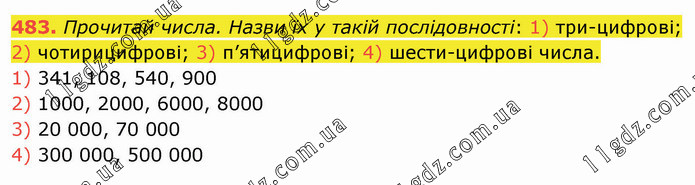 Прочитай числа. Назви їх у такій послідовності: 1) три-цифрові; 2) чотирицифрові; 3) п’ятицифрові; 4) шести-цифрові числа. 1) 341, 108, 540, 900 2) 1000, 2000, 6000, 8000 3) 20 000, 70 000 4) 300 000, 500 000