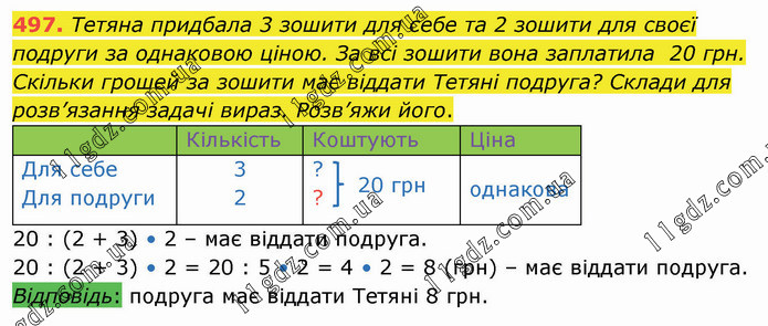 Тетяна придбала 3 зошити для себе та 2 зошити для своєї подруги за однаковою ціною. За всі зошити вона заплатила 20 грн. Скільки грошей за зошити має віддати Тетяні подруга? Склади для розв’язання задачі вираз. Розв’яжи його. Кількість Коштують Ціна Для себе Для подруги 3 2 ? ? однакова 20 : (2 + 3) • 2 – має віддати подруга. 20 : (2 + 3) • 2 = 20 : 5 • 2 = 4 • 2 = 8 (грн) – має віддати подруга. Відповідь: подруга має віддати Тетяні 8 грн.
