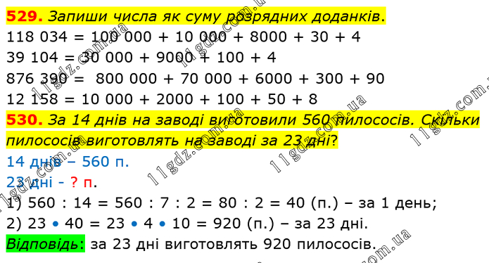 Запиши числа як суму розрядних доданків. 118 034 = 100 000 + 10 000 + 8000 + 30 + 4 39 104 = 30 000 + 9000 + 100 + 4 876 390 = 800 000 + 70 000 + 6000 + 300 + 90 12 158 = 10 000 + 2000 + 100 + 50 + 8 530. За 14 днів на заводі виготовили 560 пилососів. Скільки пилососів виготовлять на заводі за 23 дні? 14 днів – 560 п. 23 дні - ? п. 1) 560 : 14 = 560 : 7 : 2 = 80 : 2 = 40 (п.) – за 1 день; 2) 23 • 40 = 23 • 4 • 10 = 920 (п.) – за 23 дні. Відповідь: за 23 дні виготовлять 920 пилососів.
