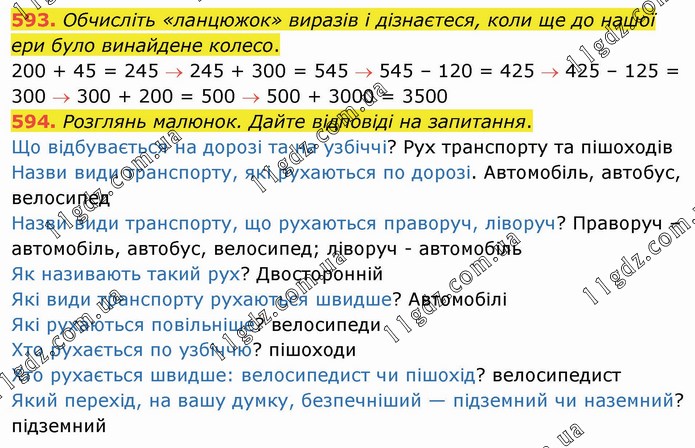 Обчисліть «ланцюжок» виразів і дізнаєтеся, коли ще до нашої ери було винайдене колесо. 200 + 45 = 245 245 + 300 = 545 545 – 120 = 425 425 – 125 = 300 300 + 200 = 500 500 + 3000 = 3500 594. Розглянь малюнок. Дайте відповіді на запитання. Що відбувається на дорозі та на узбіччі? Рух транспорту та пішоходів Назви види транспорту, які рухаються по дорозі. Автомобіль, автобус, велосипед Назви види транспорту, що рухаються праворуч, ліворуч? Праворуч – автомобіль, автобус, велосипед; ліворуч - автомобіль Як називають такий рух? Двосторонній Які види транспорту рухаються швидше? Автомобілі Які рухаються повільніше? велосипеди Хто рухається по узбіччю? пішоходи Хто рухається швидше: велосипедист чи пішохід? велосипедист Який перехід, на вашу думку, безпечніший — підземний чи наземний? підземний