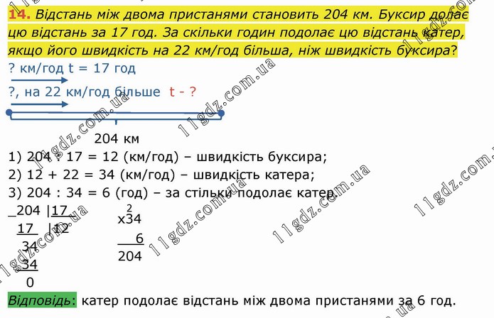 Відстань між двома пристанями становить 204 км. Буксир долає цю відстань за 17 год. За скільки годин подолає цю відстань катер, якщо його швидкість на 22 км/год більша, ніж швидкість буксира? ? км/год t = 17 год ?, на 22 км/год більше t - ? 204 км 1) 204 : 17 = 12 (км/год) – швидкість буксира; 2) 12 + 22 = 34 (км/год) – швидкість катера; 3) 204 : 34 = 6 (год) – за стільки подолає катер.