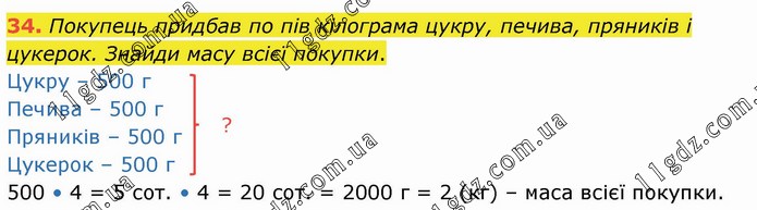 Покупець придбав по пів кілограма цукру, печива, пряників і цукерок. Знайди масу всієї покупки. Цукру – 500 г Печива – 500 г Пряників – 500 г Цукерок – 500 г 500 • 4 = 5 сот. • 4 = 20 сот. = 2000 г = 2 (кг) – маса всієї покупки.