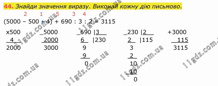 Знайди значення виразу. Виконай кожну дію письмово. (5000 – 500 • 4) + 690 : 3 : 2 = 3115
