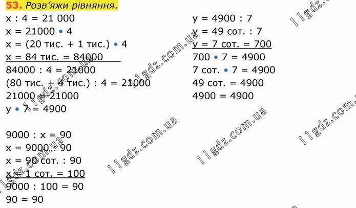 Розв’яжи рівняння. х : 4 = 21 000 х = 21000 • 4 х = (20 тис. + 1 тис.) • 4 х = 84 тис. = 84000___ 84000 : 4 = 21000 (80 тис. + 4 тис.) : 4 = 21000 21000 = 21000 у • 7 = 4900 у = 4900 : 7 у = 49 сот. : 7 у = 7 сот. = 700 700 • 7 = 4900 7 сот. • 7 = 4900 49 сот. = 4900 4900 = 4900 9000 : х = 90 х = 9000 : 90 х = 90 сот. : 90 х = 1 сот. = 100 9000 : 100 = 90 90 = 90