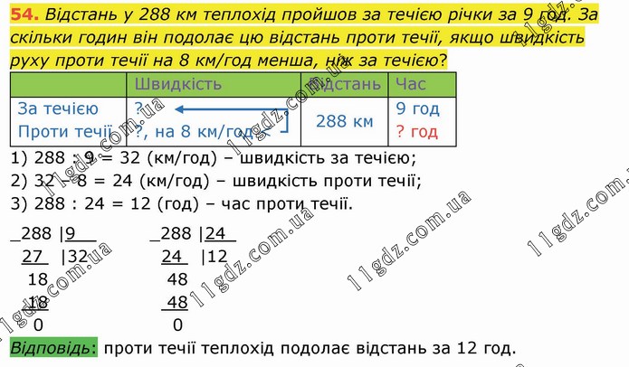 Відстань у 288 км теплохід пройшов за течією річки за 9 год. За скільки годин він подолає цю відстань проти течії, якщо швидкість руху проти течії на 8 км/год менша, ніж за течією? Швидкість Відстань Час За течією Проти течії ? ?, на 8 км/год < 288 км 9 год ? год 1) 288 : 9 = 32 (км/год) – швидкість за течією; 2) 32 – 8 = 24 (км/год) – швидкість проти течії; 3) 288 : 24 = 12 (год) – час проти течії.