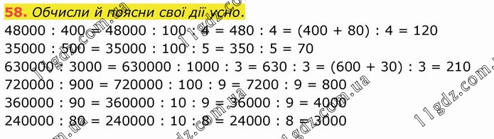 Обчисли й поясни свої дії усно. 48000 : 400 = 48000 : 100 : 4 = 480 : 4 = (400 + 80) : 4 = 120 35000 : 500 = 35000 : 100 : 5 = 350 : 5 = 70 630000 : 3000 = 630000 : 1000 : 3 = 630 : 3 = (600 + 30) : 3 = 210 720000 : 900 = 720000 : 100 : 9 = 7200 : 9 = 800 360000 : 90 = 360000 : 10 : 9 = 36000 : 9 = 4000 240000 : 80 = 240000 : 10 : 8 = 24000 : 8 = 3000