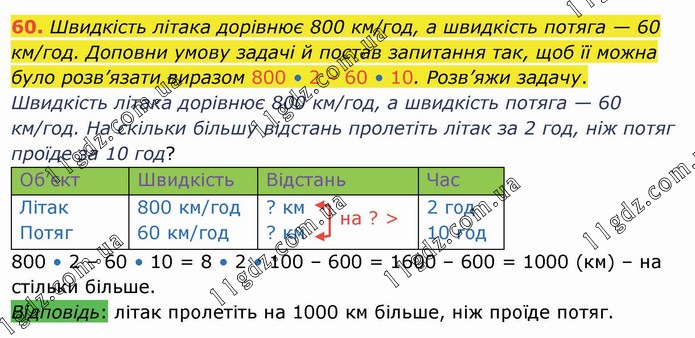 Швидкість літака дорівнює 800 км/год, а швидкість потяга — 60 км/год. Доповни умову задачі й постав запитання так, щоб її можна було розв’язати виразом 800 • 2 – 60 • 10. Розв’яжи задачу. Швидкість літака дорівнює 800 км/год, а швидкість потяга — 60 км/год. На скільки більшу відстань пролетіть літак за 2 год, ніж потяг проїде за 10 год? Об’єкт Швидкість Відстань Час Літак Потяг 800 км/год 60 км/год ? км ? км 2 год 10 год 800 • 2 – 60 • 10 = 8 • 2 • 100 – 600 = 1600 – 600 = 1000 (км) – на стільки більше. Відповідь: літак пролетіть на 1000 км більше, ніж проїде потяг.