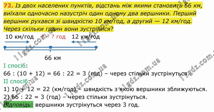Із двох населених пунктів, відстань між якими становить 66 км, виїхали одночасно назустріч один одному два вершники. Перший вершник рухався зі швидкістю 10 км/год, а другий — 12 км/год. Через скільки годин вони зустрілися? 10 км/год t – ? год 12 км/год 66 км І спосіб: 66 : (10 + 12) = 66 : 22 = 3 (год) – через стільки зустрінуться. ІІ спосіб: 1) 10 + 12 = 22 (км/год) – швидкість з якою вершники зближуються. 2) 66 : 22 = 3 (год) – через стільки зустрінуться. Відповідь: вершники зустрінуться через 3 год.