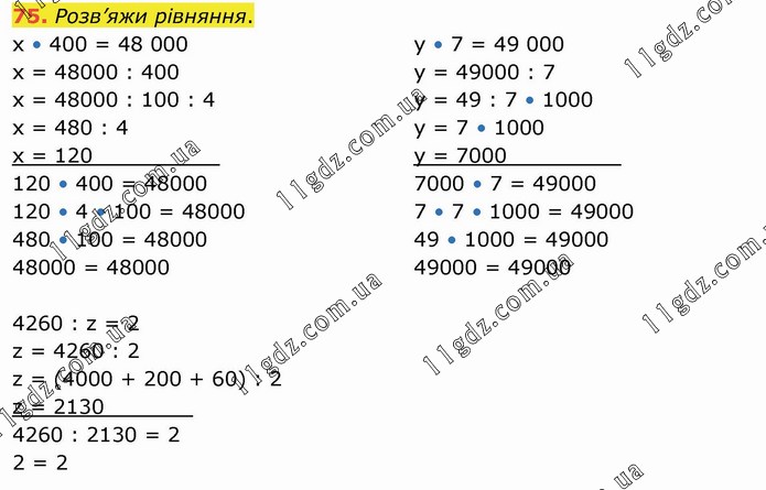 Розв’яжи рівняння. х • 400 = 48 000 х = 48000 : 400 х = 48000 : 100 : 4 х = 480 : 4 х = 120__________ 120 • 400 = 48000 120 • 4 • 100 = 48000 480 • 100 = 48000 48000 = 48000 у • 7 = 49 000 у = 49000 : 7 у = 49 : 7 • 1000 у = 7 • 1000 у = 7000_________ 7000 • 7 = 49000 7 • 7 • 1000 = 49000 49 • 1000 = 49000 49000 = 49000 4260 : z = 2 z = 4260 : 2 z = (4000 + 200 + 60) : 2 z = 2130_______ 4260 : 2130 = 2 2 = 2