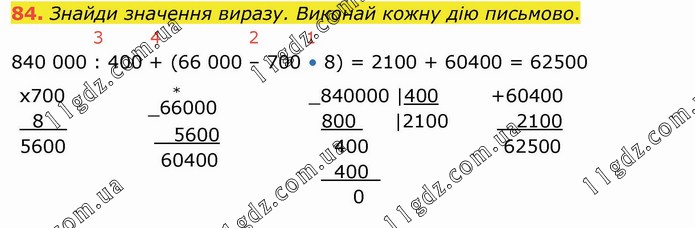 Знайди значення виразу. Виконай кожну дію письмово. 840 000 : 400 + (66 000 – 700 • 8) = 2100 + 60400 = 62500