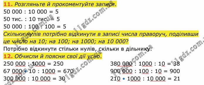 Розгляньте й прокоментуйте записи. 50 000 : 10 000 = 5 50 тис. : 10 тис. = 5 50 000 : 100 : 100 = 5 Скільки нулів потрібно відкинути в записі числа праворуч, поділивши це число на 10; на 100; на 1000; на 10 000? Потрібно відкинути стільки нулів, скільки в дільнику. 12. Обчисли й поясни свої дії усно. 250 000 : 1000 = 250 67 000 • 10 : 1000 = 670 300 000 : 10 000 = 30 380 000 : 1000 : 10 = 38 900 000 : 100 : 10 = 900 210 • 1000 : 10 000 = 21