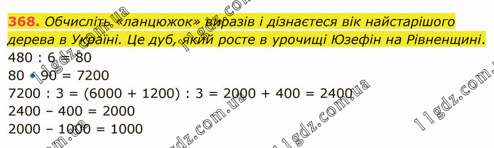 Обчисліть «ланцюжок» виразів і дізнаєтеся вік найстарішого дерева в Україні. Це дуб, який росте в урочищі Юзефін на Рівненщині. 480 : 6 = 80 80 • 90 = 7200 7200 : 3 = (6000 + 1200) : 3 = 2000 + 400 = 2400 2400 – 400 = 2000 2000 – 1000 = 1000