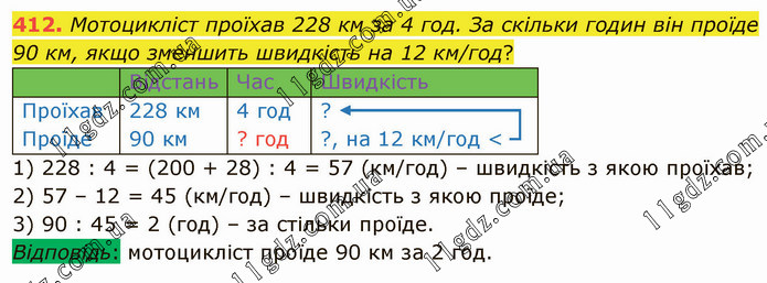 Мотоцикліст проїхав 228 км за 4 год. За скільки годин він проїде 90 км, якщо зменшить швидкість на 12 км/год? Відстань Час Швидкість Проїхав Проїде 228 км 90 км 4 год ? год ? ?, на 12 км/год < 1) 228 : 4 = (200 + 28) : 4 = 57 (км/год) – швидкість з якою проїхав; 2) 57 – 12 = 45 (км/год) – швидкість з якою проїде; 3) 90 : 45 = 2 (год) – за стільки проїде. Відповідь: мотоцикліст проїде 90 км за 2 год.