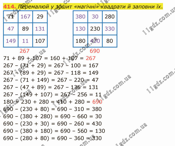 Перемалюй у зошит «магічні» квадрати й заповни їх. 71 167 29 380 30 280 47 89 131 130 230 330 149 11 107 180 430 80 267 690 71 + 89 + 107 = 160 + 107 = 267 267 – (71 + 29) = 267 – 100 = 167 267 – (89 + 29) = 267 – 118 = 149 267 – (71 + 149) = 267 – 220 = 47 267 – (47 + 89) = 267 – 136 = 131 267 – (149 + 107) = 267 – 256 = 11 180 + 230 + 280 = 410 + 280 = 690 690 – (230 + 80) = 690 – 310 = 380 690 – (380 + 280) = 690 – 660 = 30 690 – (230 + 30) = 690 – 260 = 430 690 – (380 + 180) = 690 – 560 = 130 690 – (280 + 80) = 690 – 360 = 330