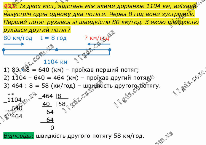 Із двох міст, відстань між якими дорівнює 1104 км, виїхали назустріч один одному два потяги. Через 8 год вони зустрілися. Перший потяг рухався зі швидкістю 80 км/год. З якою швидкістю рухався другий потяг? 80 км/год t = 8 год ? км/год 1104 км 1) 80 • 8 = 640 (км) – проїхав перший потяг; 2) 1104 – 640 = 464 (км) – проїхав другий потяг; 3) 464 : 8 = 58 (км/год) – швидкість другого потягу.