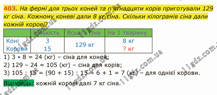 На фермі для трьох коней та п’ятнадцяти корів приготували 129 кг сіна. Кожному коневі дали 8 кг сіна. Скільки кілограмів сіна дали кожній корові? Кількість Всього сіна На 1 тварину Коні Корови 3 15 129 кг 8 кг ? кг 1) 3 • 8 = 24 (кг) – сіна для коней; 2) 129 – 24 = 105 (кг) – сіна для корів; 3) 105 : 15 = (90 + 15) : 15 = 6 + 1 = 7 (кг) – для однієї корови. Відповідь: кожній корові далі 7 кг сіна.