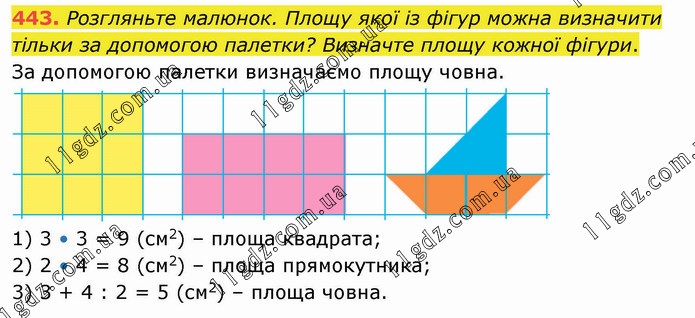 Розгляньте малюнок. Площу якої із фігур можна визначити тільки за допомогою палетки? Визначте площу кожної фігури. За допомогою палетки визначаємо площу човна. 1) 3 • 3 = 9 (см2) – площа квадрата; 2) 2 • 4 = 8 (см2) – площа прямокутника; 3) 3 + 4 : 2 = 5 (см2) – площа човна.