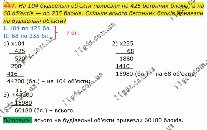 На 104 будівельні об’єкти привезли по 425 бетонних блоків, а на 68 об’єктів — по 235 блоків. Скільки всього бетонних блоків привезли на будівельні об’єкти? І. 104 по 425 бл. ІІ. 68 по 235 бл.