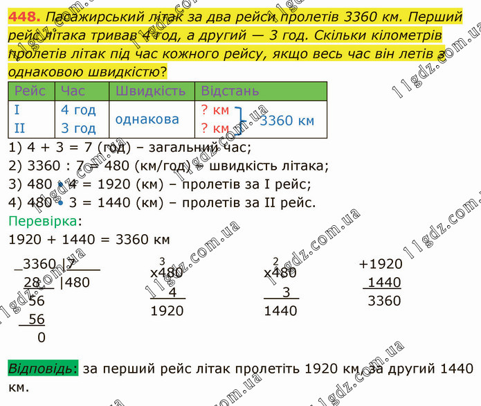 Пасажирський літак за два рейси пролетів 3360 км. Перший рейс літака тривав 4 год, а другий — 3 год. Скільки кілометрів пролетів літак під час кожного рейсу, якщо весь час він летів з однаковою швидкістю? Рейс Час Швидкість Відстань І ІІ 4 год 3 год однакова ? км ? км 1) 4 + 3 = 7 (год) – загальний час; 2) 3360 : 7 = 480 (км/год) – швидкість літака; 3) 480 • 4 = 1920 (км) – пролетів за І рейс; 4) 480 • 3 = 1440 (км) – пролетів за ІІ рейс. Перевірка: 1920 + 1440 = 3360 км Відповідь: за перший рейс літак пролетіть 1920 км, за другий 1440 км.