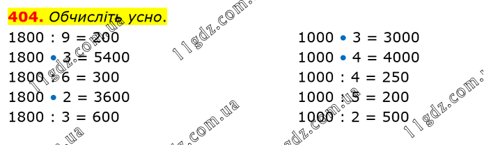 Обчисліть усно. 1800 : 9 = 200 1800 • 3 = 5400 1800 : 6 = 300 1800 • 2 = 3600 1800 : 3 = 600 1000 • 3 = 3000 1000 • 4 = 4000 1000 : 4 = 250 1000 : 5 = 200 1000 : 2 = 500