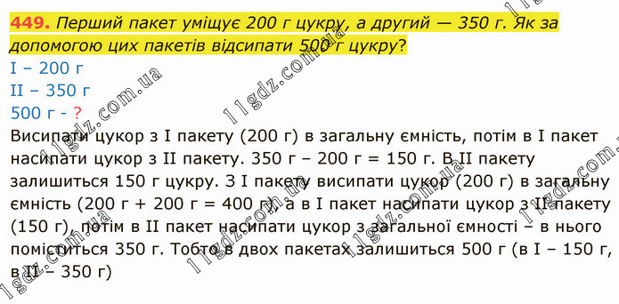 Перший пакет уміщує 200 г цукру, а другий — 350 г. Як за допомогою цих пакетів відсипати 500 г цукру? І – 200 г ІІ – 350 г 500 г - ? Висипати цукор з І пакету (200 г) в загальну ємність, потім в І пакет насипати цукор з ІІ пакету. 350 г – 200 г = 150 г. В ІІ пакету залишиться 150 г цукру. З І пакету висипати цукор (200 г) в загальну ємність (200 г + 200 г = 400 г), а в І пакет насипати цукор з ІІ пакету (150 г), потім в ІІ пакет насипати цукор з загальної ємності – в нього поміститься 350 г. Тобто в двох пакетах залишиться 500 г (в І – 150 г, в ІІ – 350 г)
