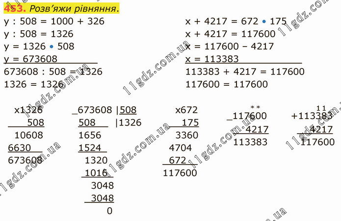 Розв’яжи рівняння. у : 508 = 1000 + 326 у : 508 = 1326 у = 1326 • 508 у = 673608_______ 673608 : 508 = 1326 1326 = 1326 х + 4217 = 672 • 175 х + 4217 = 117600 х = 117600 – 4217 х = 113383___________ 113383 + 4217 = 117600 117600 = 117600