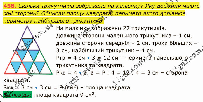 Скільки трикутників зображено на малюнку? Яку довжину мають їхні сторони? Обчисли площу квадрата, периметр якого дорівнює периметру найбільшого трикутника. На малюнку зображено 27 трикутників. Довжина сторони маленького трикутника – 1 см, довжина сторони середніх – 2 см, трохи більших – 3 см, найбільший трикутник – 4 см. Ртр = 4 см • 3 = 12 см – периметр найбільшого трикутника та квадрата. Ркв = 4 • а, а = Р : 4 = 12 : 4 = 3 см – сторона квадрата. Sкв = 3 см • 3 см = 9 (см2) – площа квадрата. Відповідь: площа квадрата 9 см2.