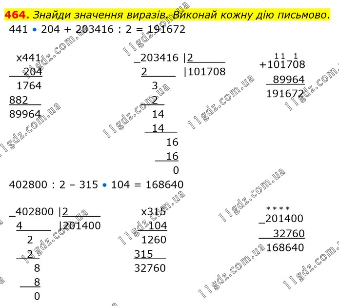Знайди значення виразів. Виконай кожну дію письмово. 441 • 204 + 203416 : 2 = 191672; 402800 : 2 – 315 • 104 = 168640