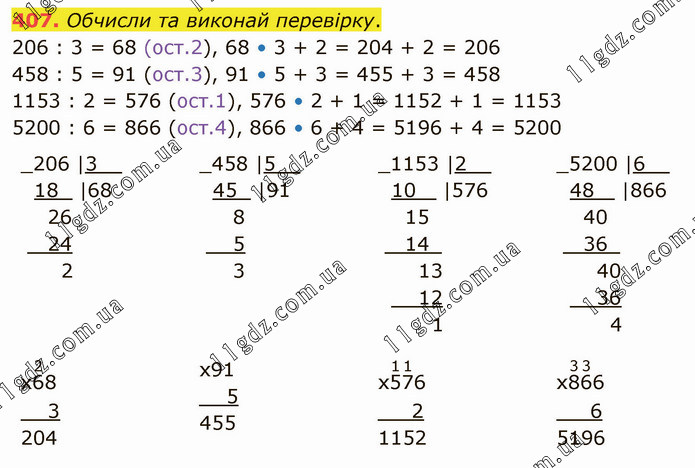 Обчисли та виконай перевірку. 206 : 3 = 68 (ост.2), 68 • 3 + 2 = 204 + 2 = 206 458 : 5 = 91 (ост.3), 91 • 5 + 3 = 455 + 3 = 458 1153 : 2 = 576 (ост.1), 576 • 2 + 1 = 1152 + 1 = 1153 5200 : 6 = 866 (ост.4), 866 • 6 + 4 = 5196 + 4 = 5200