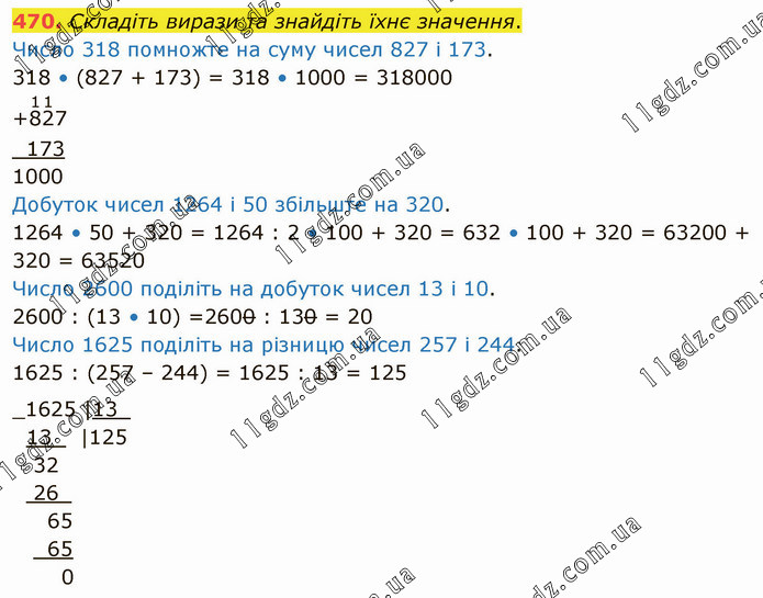 Складіть вирази та знайдіть їхнє значення. Число 318 помножте на суму чисел 827 і 173. 318 • (827 + 173) = 318 • 1000 = 318000 Добуток чисел 1264 і 50 збільште на 320. 1264 • 50 + 320 = 1264 : 2 • 100 + 320 = 632 • 100 + 320 = 63200 + 320 = 63520 Число 2600 поділіть на добуток чисел 13 і 10. 2600 : (13 • 10) =2600 : 130 = 20 Число 1625 поділіть на різницю чисел 257 і 244. 1625 : (257 – 244) = 1625 : 13 = 125